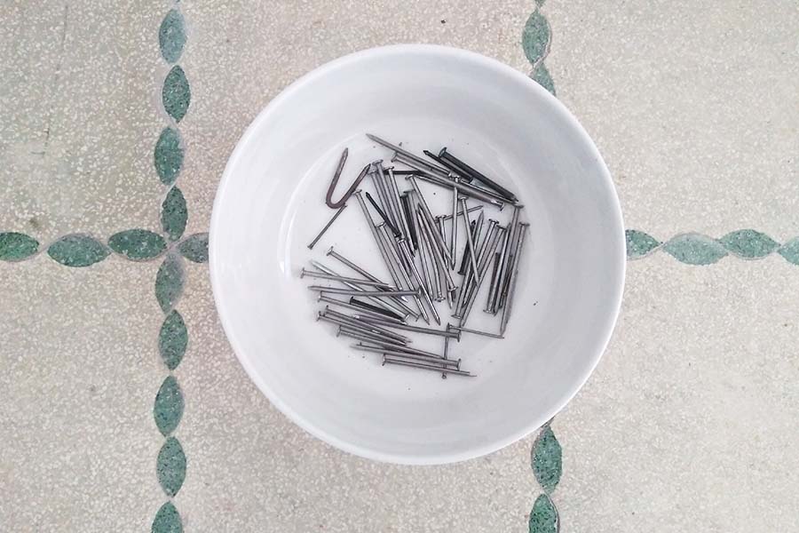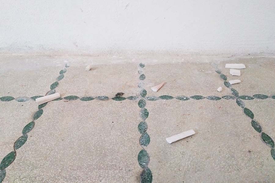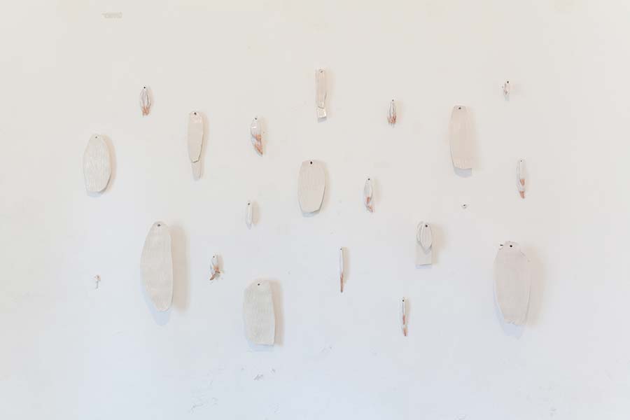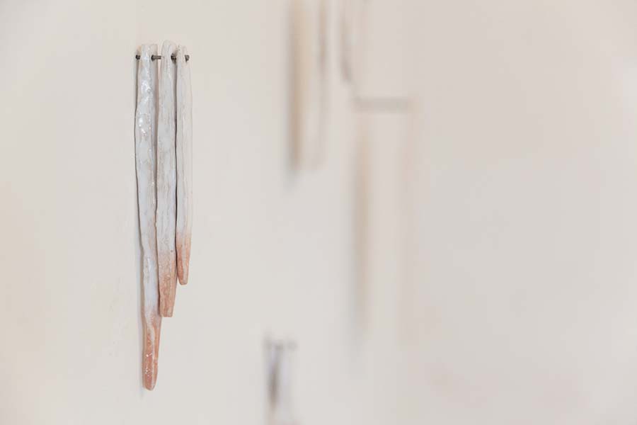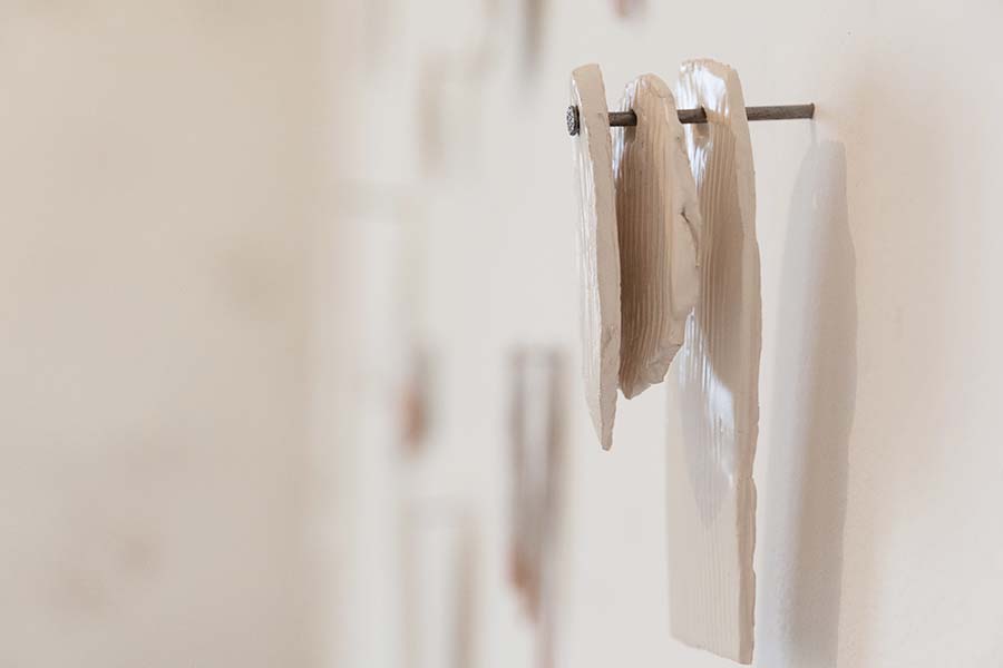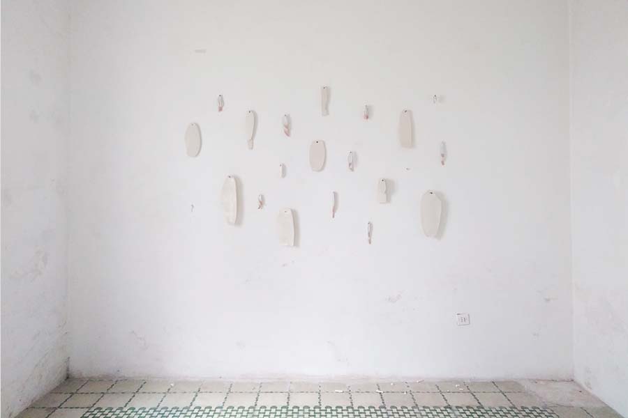 Che suono potrebbe avere il limite? Che forma potrebbe avere il labile rapporto d’incontro-scontro tra due entità? Partendo da questi quesiti la ricerca di Arianna De Nicola si propone di indagare le relazioni tra individui, affrontando il tema del limite sia come soglia di creazione sia come principio drammatico originario di una possibile rottura. L’interesse nei confronti delle variabili e verso la coesistenza della creazione e della distruzione danno origine ad un’indagine metaforica rispetto all’agire e alle relazioni umane, al comportamento, alle conseguenze. Eliminando tutto ciò che è superfluo, l’artista si concentra sulla poetica dell’incontro e dello scontro, senza nessuna prova, né finale prestabilito. Una riflessione sulla trasformazione di tutte le cose, che si traduce in un agire senza ripetizioni che lascia al caso le alterazioni dei corpi in un sistema in stato di equilibrio instabile. Arianna ha immaginato di creare uno spazio evocativo, denso di strutture sonore e immagini che richiamano il cambio sviluppando lavori installativi scultorei e performativi che invitano il pubblico alla riflessione sull’incontro e sullo scontro, dove lo spiazzamento è affrontato in forma leggera. Attraverso la ceramica, materia solida e labile allo stesso tempo, De Nicola esprime in senso plastico la fragilità dell’armonia, riflettendo sulla pratica della scultura come esperienza umana. Se nella prima installazione sensoriale l’oscillazione casuale delle sue parti nel vuoto dello spazio produce la nascita del suono e, al contempo, la possibilità di una destabilizzante rottura come conseguenza allo scontro; la seconda, in parte caratterizzata da un’azione performativa dell’artista realizzata al momento dell’installazione dell’opera, si propone di sviluppare, attraverso il gesto d’inchiodare delle ceramiche alla parete, la tematica della moltitudine e dell’insieme come metafora del coraggio dell’unione con possibili conseguenze. Non casuale la decisione di sviluppare le opere in uno spazio domestico, un luogo con un vissuto interpersonale che evoca l’inizio e la fine di un rapporto.
